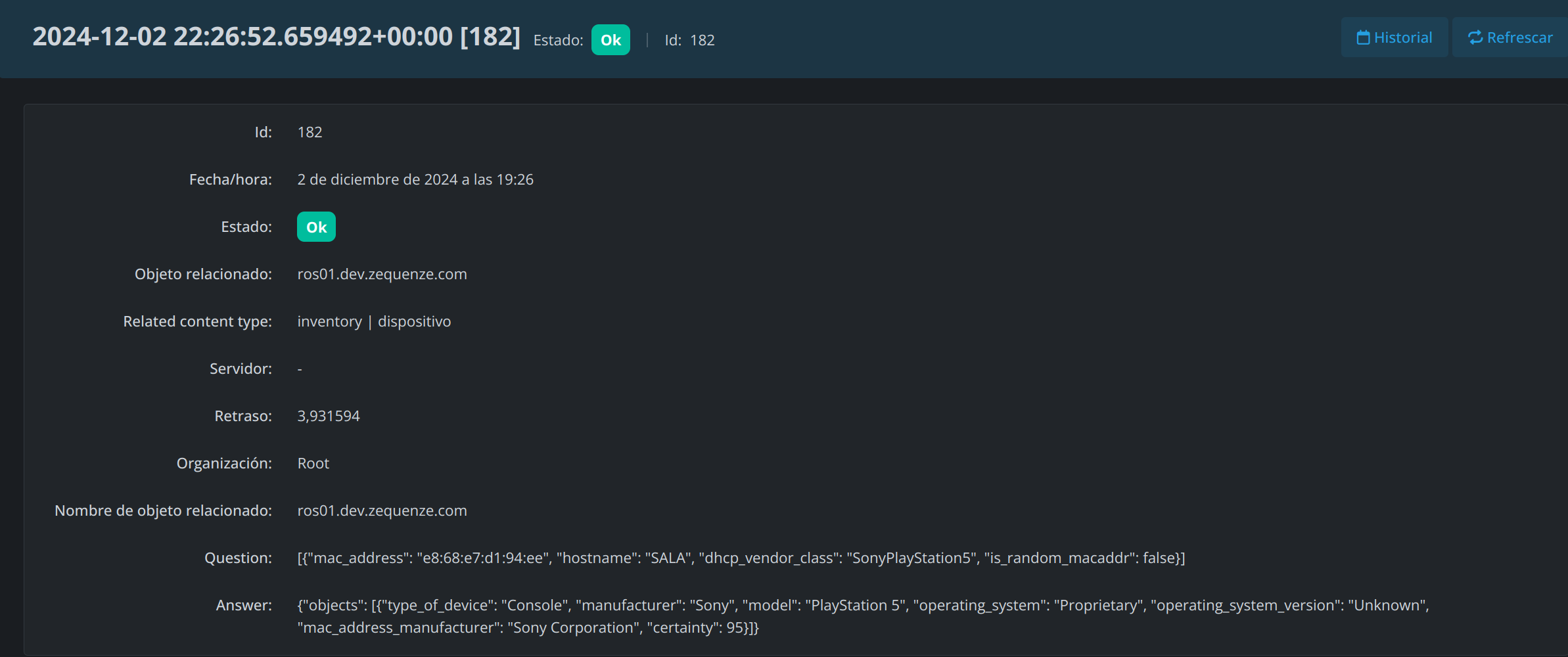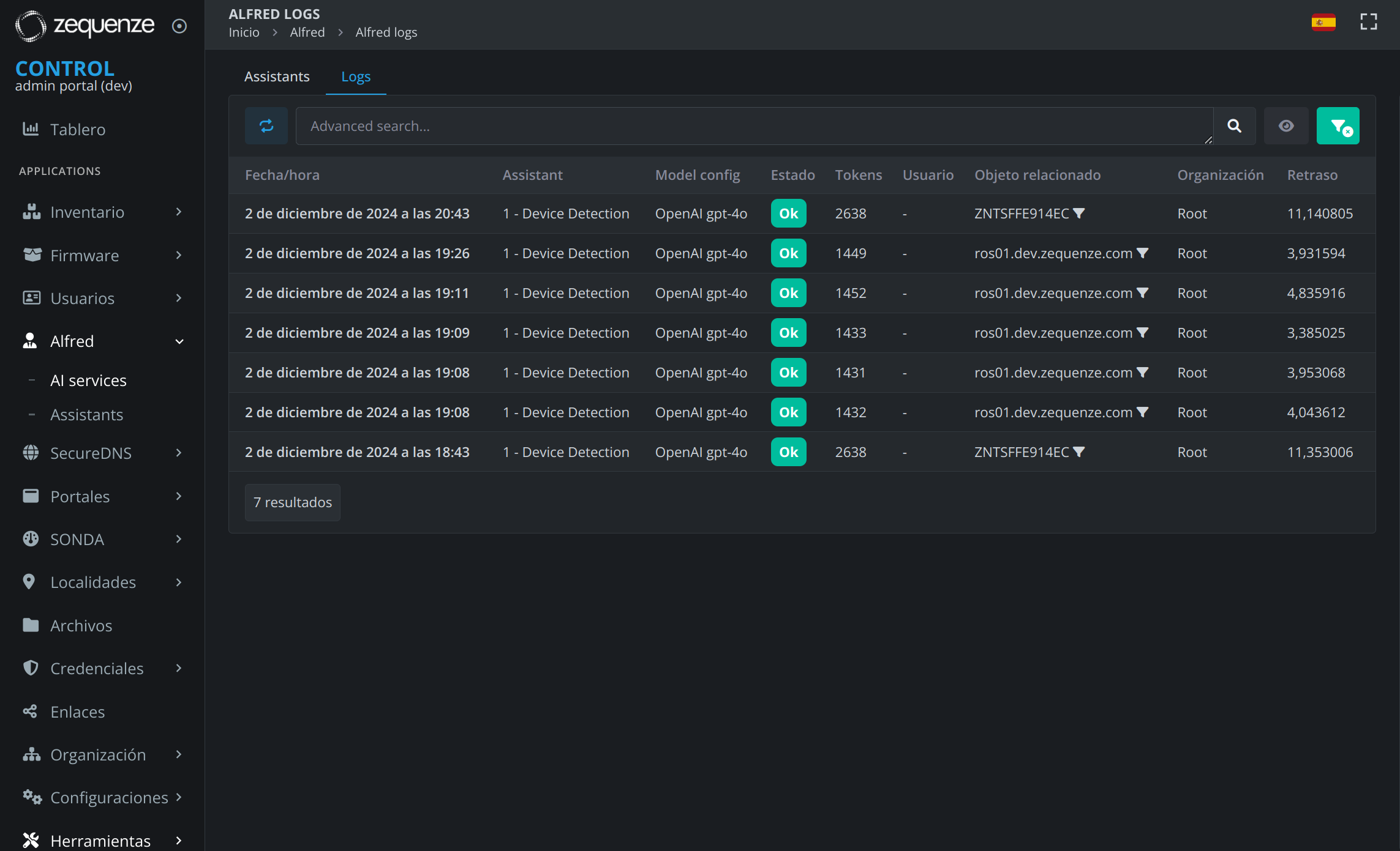 The log is updated with the assistant's response, tokens used, and execution delay. -