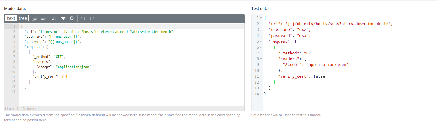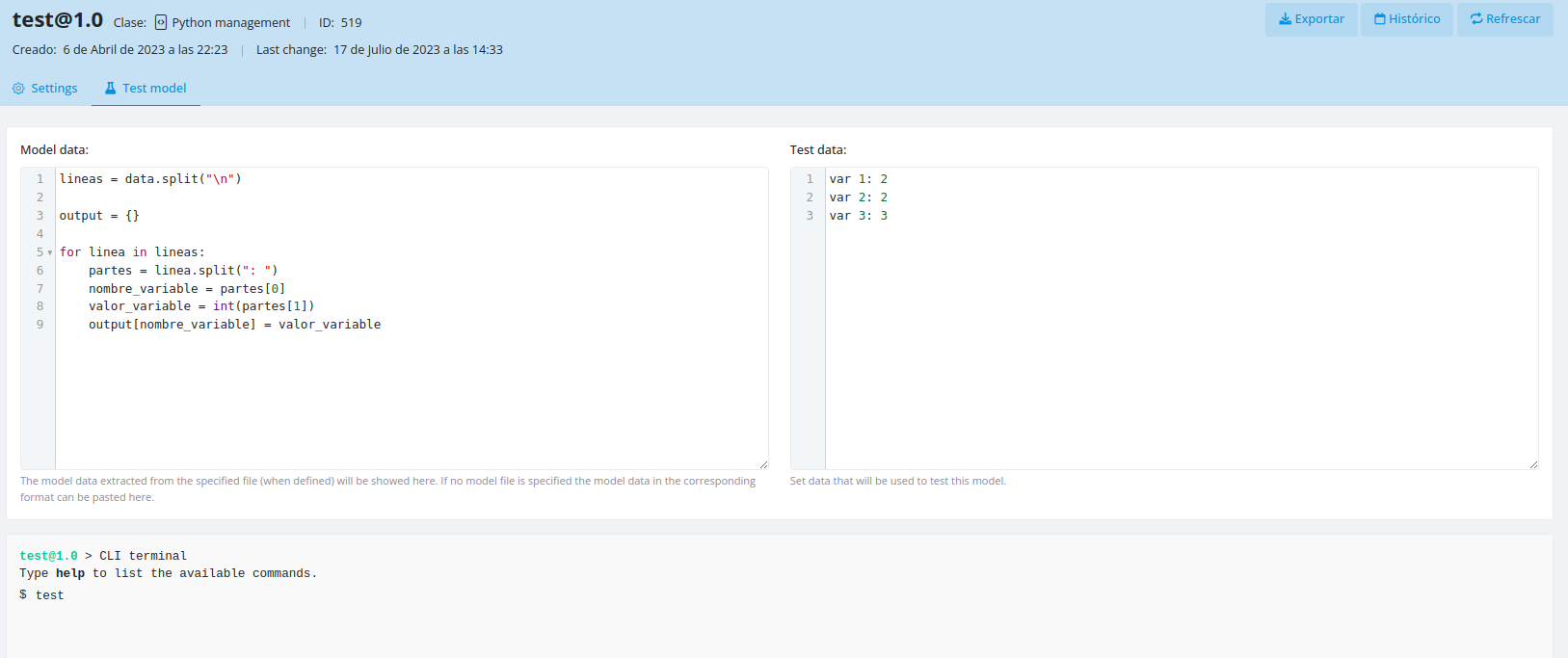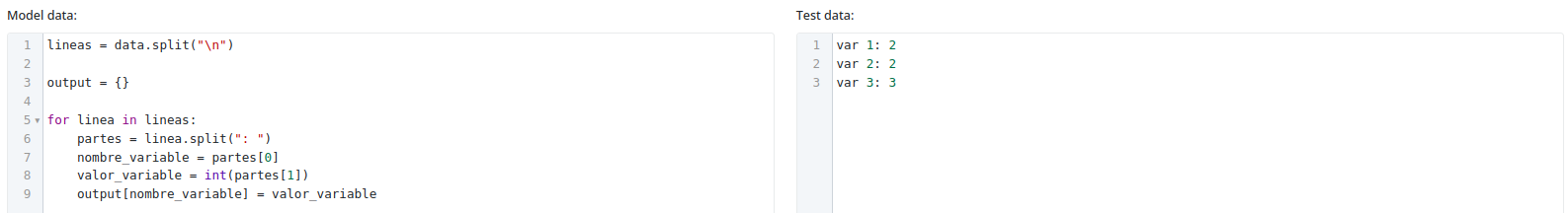 Model data format: Python code that uses a data variable, which will be populated with the content from the Test data input.