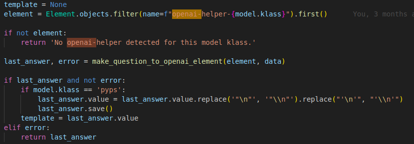 The make_question_to_openai_element() function executes an OpenAI API call using:
