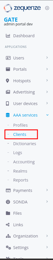 When the AAA Services menu expands, select "Clients" from the dropdown options.