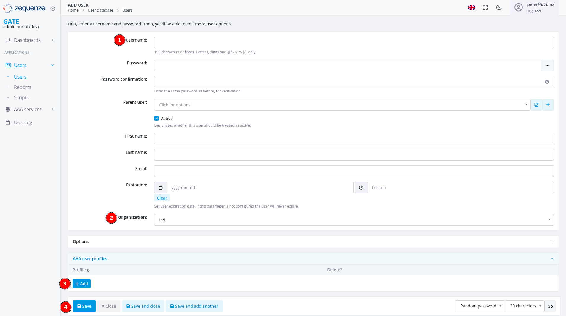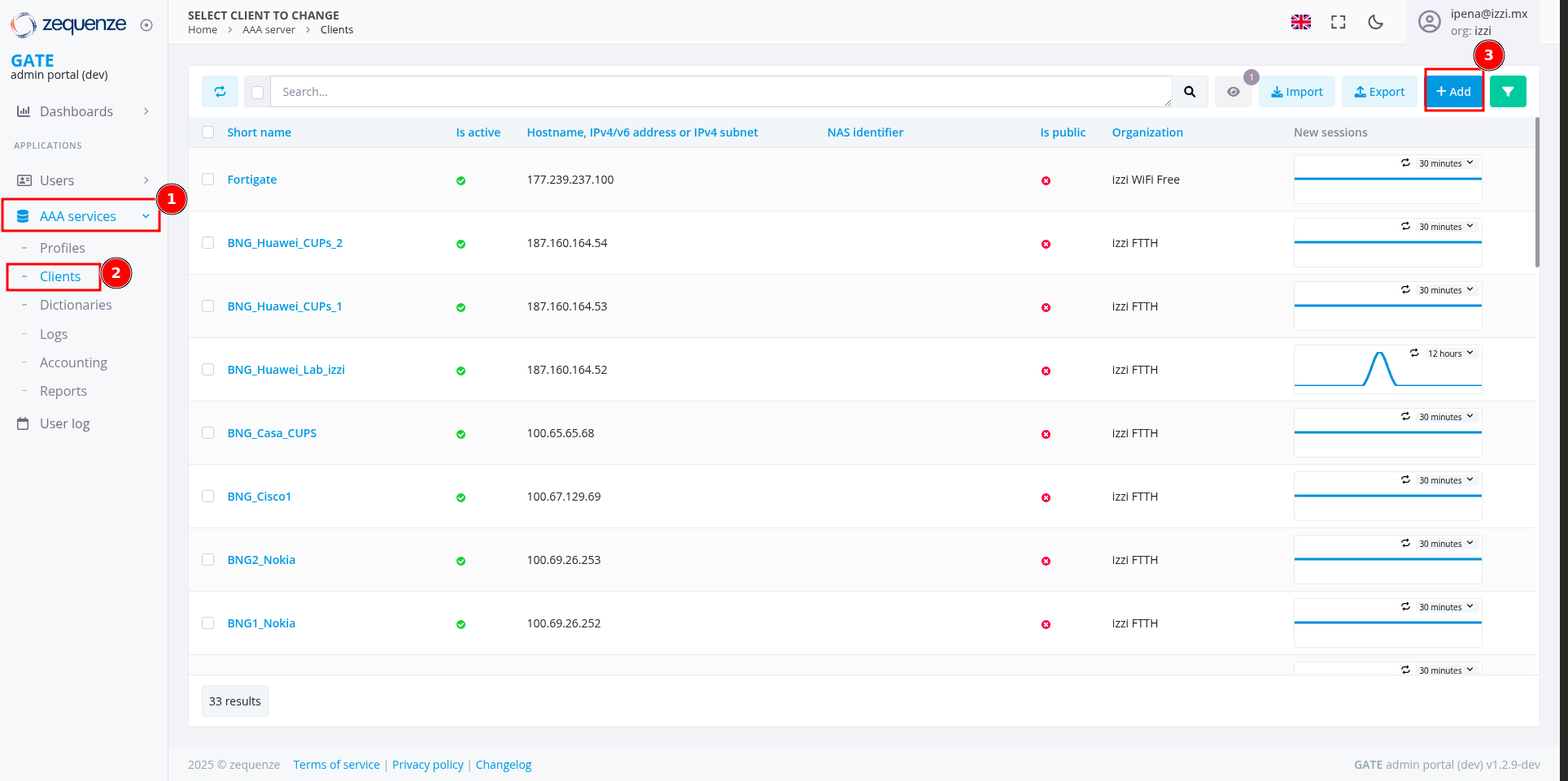 El usuario Admin para izzi cuenta con permisos completos en la plataforma GATE, permitiendo crear, modificar y eliminar tanto clientes AAA para servicios RADIUS como usuarios autenticados en el sistema.