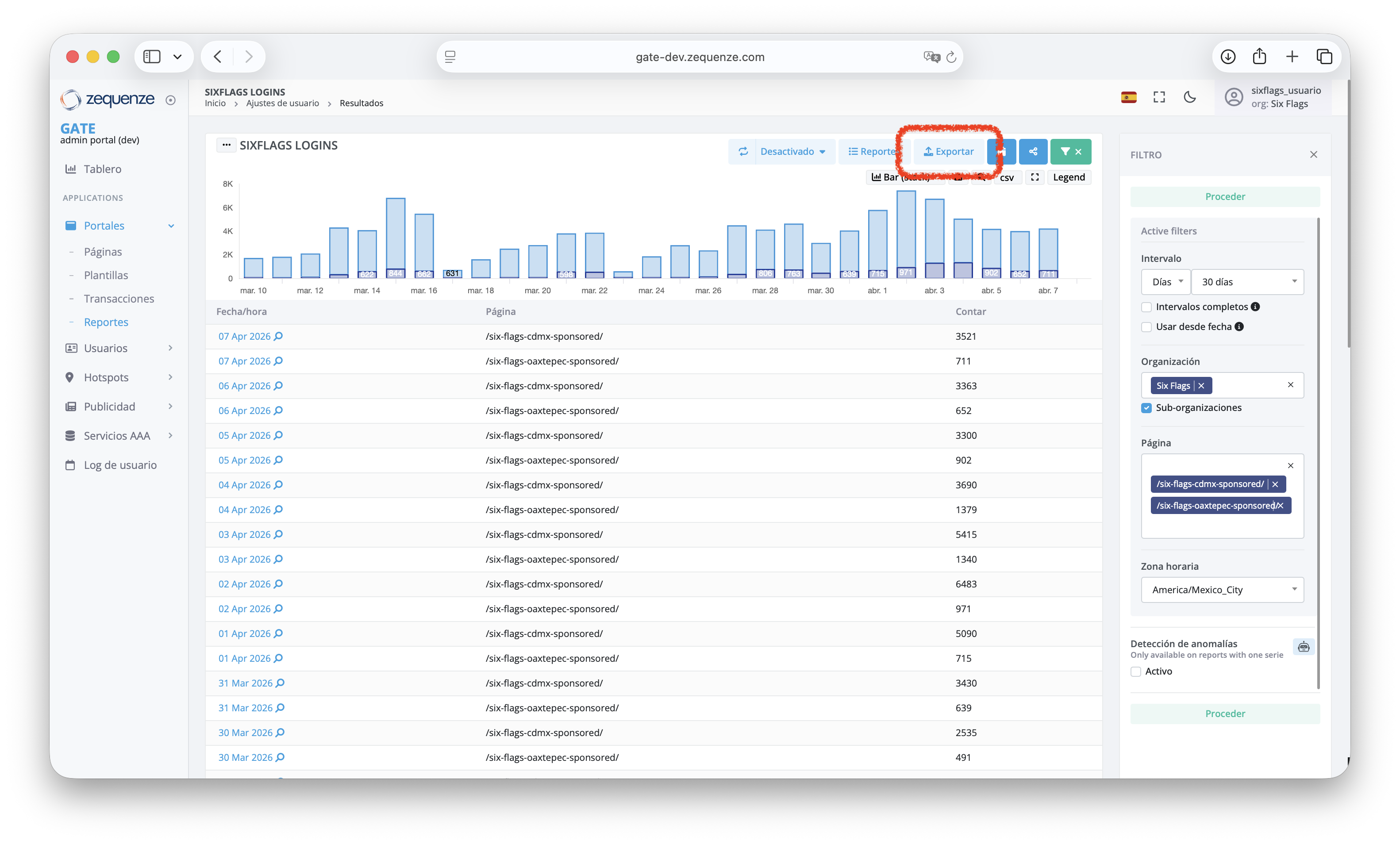 Si se desea más información sobre un reporte en particular, al hacer click sobre su título se puede visualizar y modificar los parámetros del reporte, así como exportar la información en formato csv.